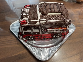 今年も期待以上の素敵なケーキをありがとうございました! 細部まで作り込んでいただいていて、親子で感激いたしました。 特に息子は、「STORM CHASER」の文字が書かれている側面がお気に入りで、 「青い部分はどうやって作ったんだろう。食べるのがもったいない!」と、ずっと眺めていました。 竜巻追跡車TIV2という、変わった注文に応えていただき、本当にありがとうございました!