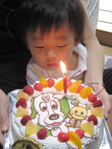 こういった肝心なときに熱を出し、39度ありながらもろうそくに火をともした途端、ケーキをみるなり、『うーうーうー』と大声を上げ喜んでました。結局食欲がなく、食べてはもらえなかったものの、大人たちでペロリと頂きました。とてもおいしかったです。